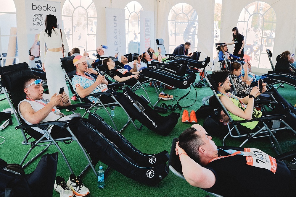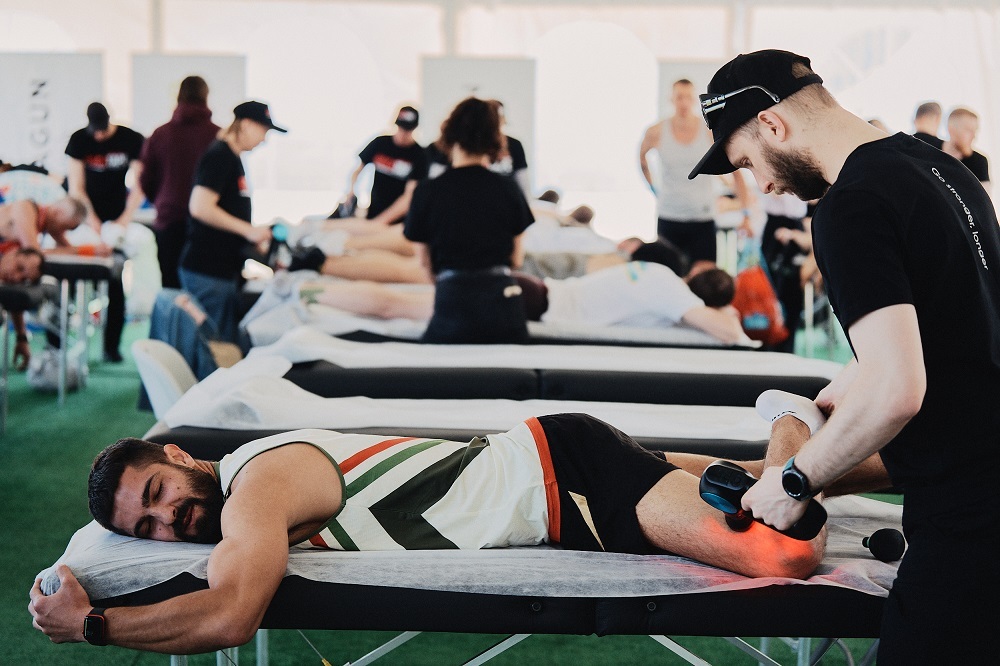 Внутри шатра царила атмосфера заботы и профессионализма: на 30 массажных столах трудились опытные массажисты, которые умело сочетали ручной массаж с современными перкуссионными устройствами, такими как Theragun PRO Plus и массажеры D5 Pro от Beoka.