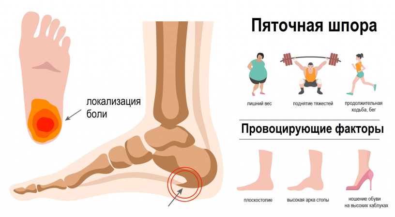 Факторы развития пяточной шпоры самые разнообразные: плоскостопие, избыточный вес, чрезмерные перегрузки стопы, очень высокий или низкий свод стопы, врожденные и приобретенные деформации стоп, сколиоз, остеохондроз, деформирующий артроз тазобедренного или коленного суставов, артриты различной этиологии, сахарный диабет.