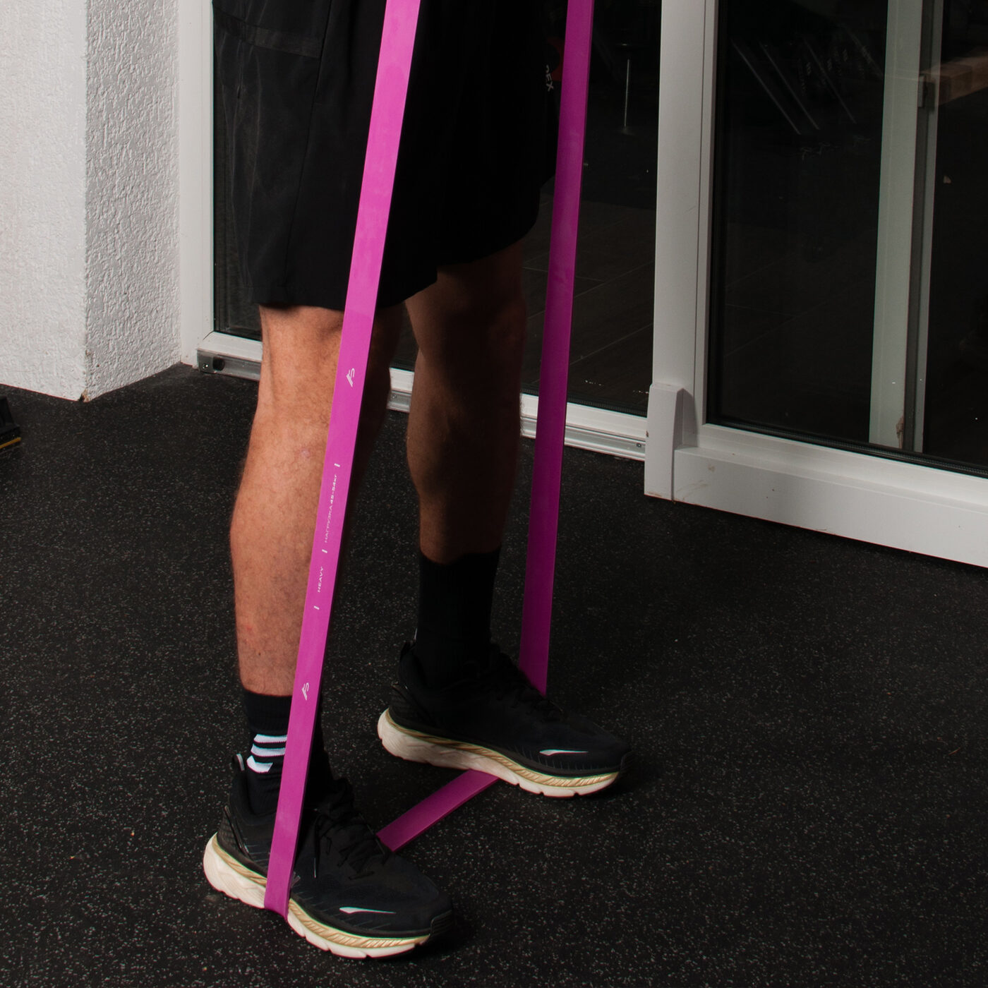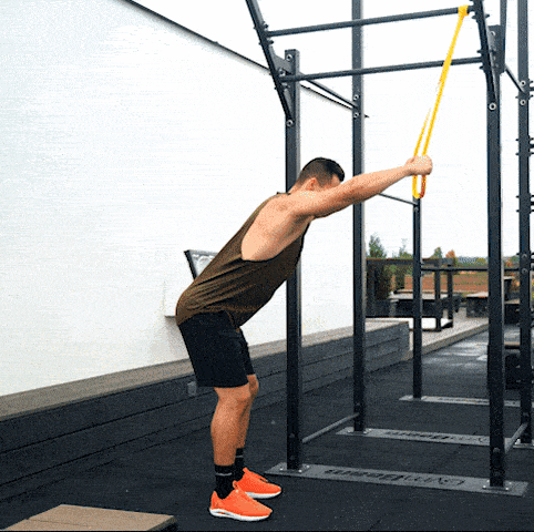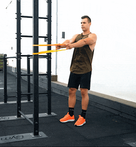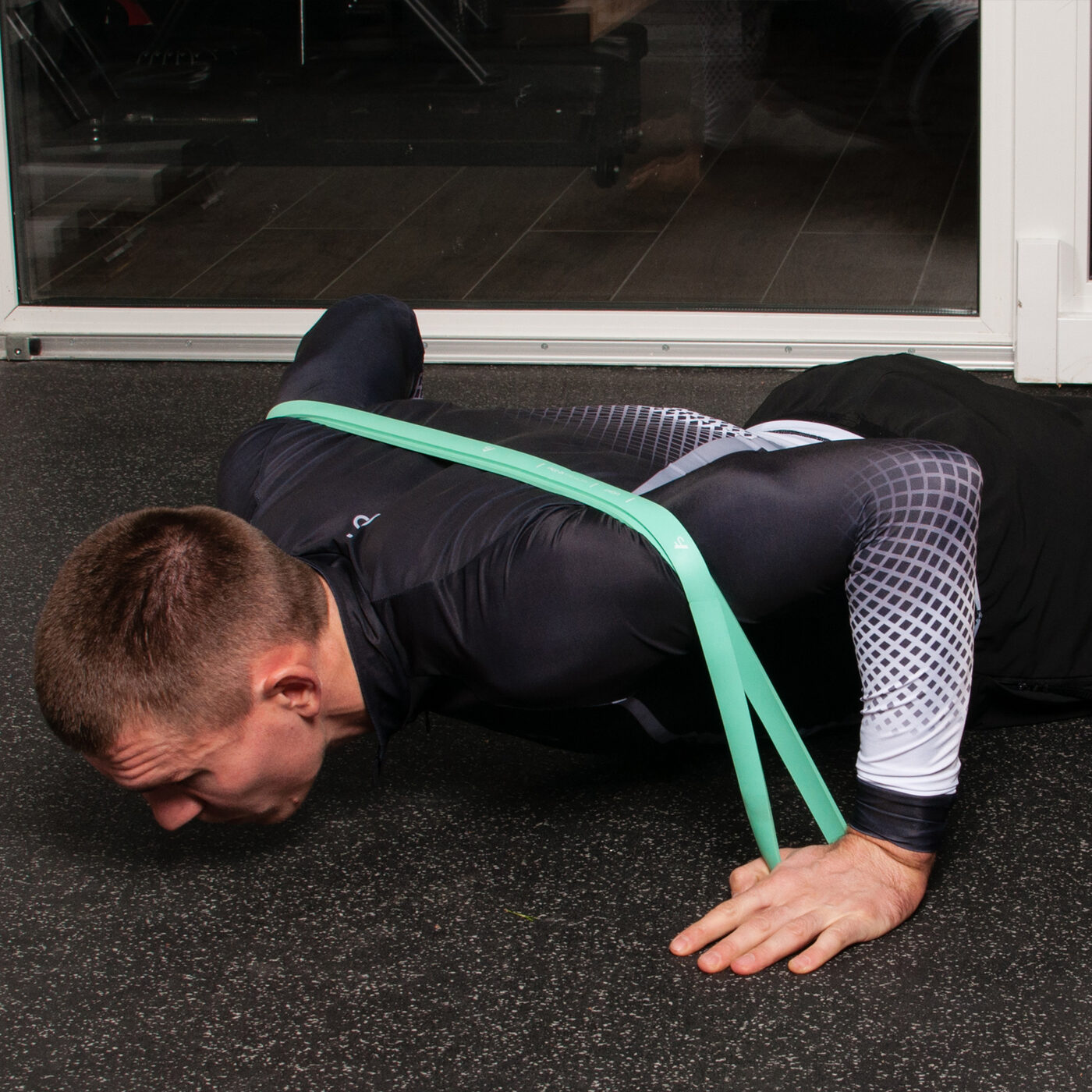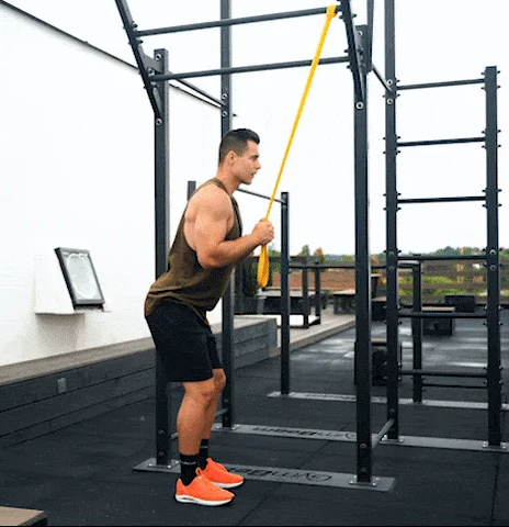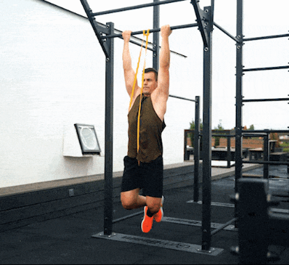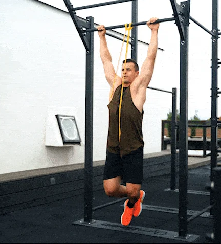 Оберните эспандер вокруг верхней планки турника для подтягиваний. Удерживая перекладину перекрестным хватом (локти направлены от тела), поставьте руки шире плеч. Поставьте колени или ступни на ленту. Отведите лопатки назад и вниз, при этом удерживайте ноги на ленте.